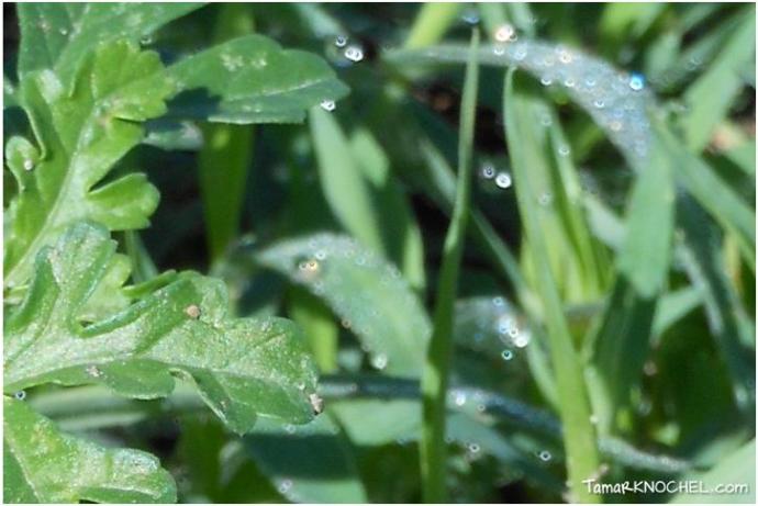 Having just defended my watermelon and pumpkin vines from the weeds, my eyes were met with wonder when I plunked down on a cinderblock nearby to bask in my victory over the enemy invaders. It had rained the night before and there in the tender shoots of grass at the edge of the garden were hundreds of these tiny orbs of light filled with rainbows! I jumped straight up to retrieve my camera from the house before the rapidly rising heat from the sun would evaporate these little treasures. I am sad to admit that I did them no justice in my photography, but I tried.