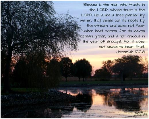 The first part of this verse sounds so harsh, CURSED is the man… shrub in the desert… no good will come his way… dwell in the parched places… wilderness… uninhabited. Yet look at WHY that man is cursed and living in parched places, his HEART has turned away from the LORD. If you read down to the very end of this section of Jeremiah 17 to verse 13 we may understand a bit better why turning away from the LORD would cause dryness.
