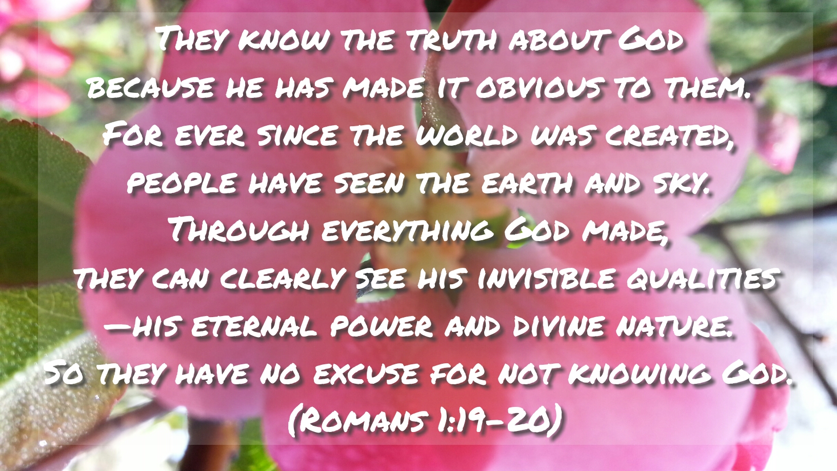 19 They know the truth about God because he has made it obvious to them. 20 For ever since the world was created, people have seen the earth and sky. Through everything God made, they can clearly see his invisible qualities—his eternal power and divine nature. So they have no excuse for not knowing God. (Romans 1:19-20)
