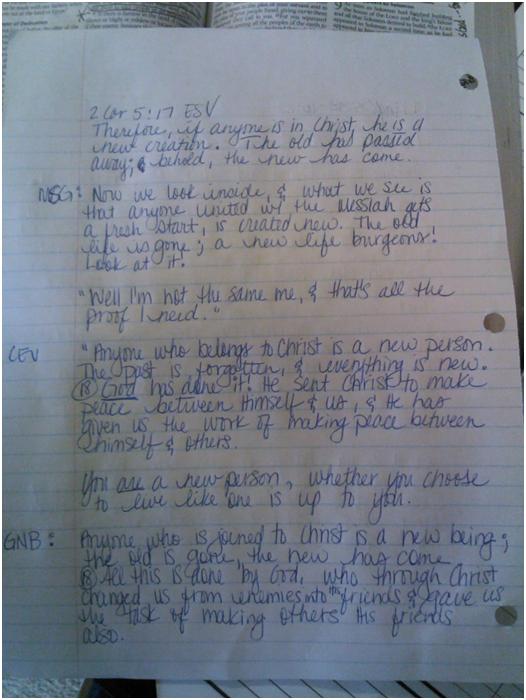 So I opened up my ESV Bible and looked it up and wrote it down. And usually my method of memorizing a verse is to just write it down over and over again until I’ve got it sunk in real good. But this time was different. I hadn’t checked out other translations yet to see if any of them resounded with me better than the ESV. And this is where the real transformation started to take place. So, because it was so special for me, I’m going to share with you my page I was writing on.