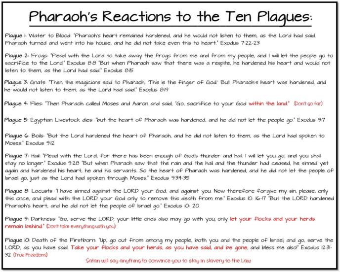 In the first few plagues Pharoah promises freedom, but then changes his mind and denys them that promised freedom. This is the Law to a tee! It promises freedom, but by itself brings us nothing but more chains, more rules to break and feel guilty over. The promised freedom that the Law does bring is Jesus. Jesus is the complete and total fulfillment of the Law. Every single requirement the Law has Jesus has fulfilled those requirements. He IS the perfect sacrificial Lamb, in Him there is no darkness, there is no captivity, there are no more requirements. Jesus asks for nothing in return but respect and thanksgiving for what He has done for us. Personally I don’t think that’s too much to ask.