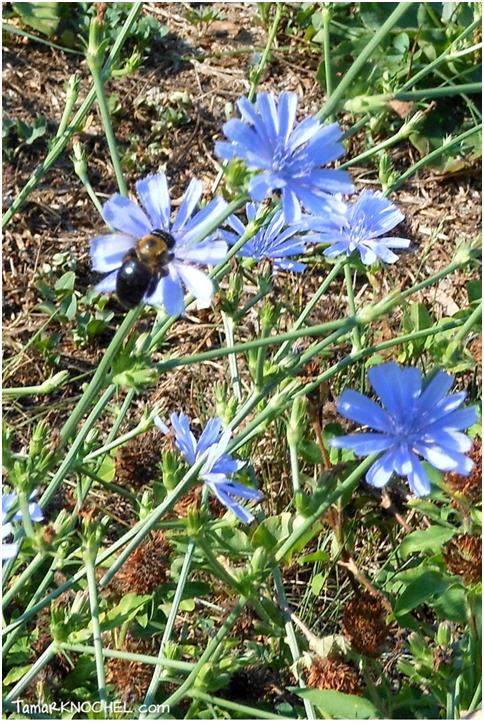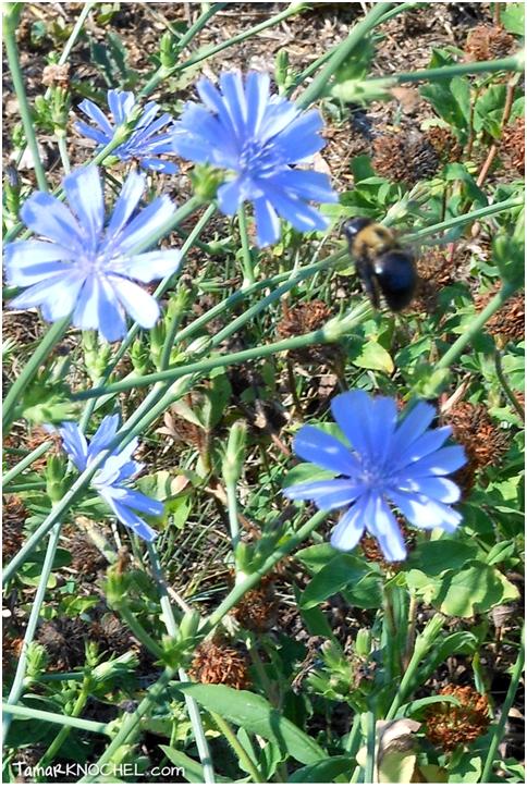 Standing in the middle of this little field of forget-me-not blue, snapping away as fast as my little point and shoot could keep up I slowly became aware of a great buzzing about me which momentarily drew my eyes away from my camera screen to look about myself. While I was over with the sunflower standing there alone there was only the occasional bee here and there. But here, amongst these many flowers there were many bees; and not that many small ones either. They were all large bumble bees.