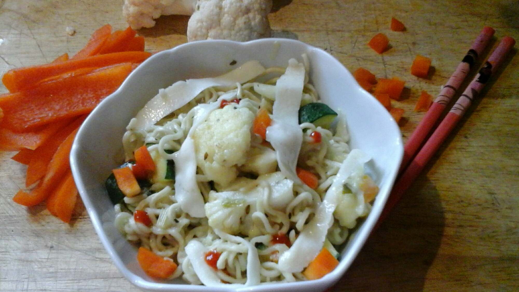 *While veggies are cooking, put Ramen noodles (noodles only) in a heat safe bowl and add hot water. Let soak for 3-4 minutes until noodles are tender. Add noodles only to sauté pan with veggies.