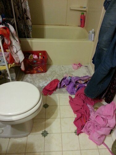 This is the sight that greeted me as I walked into the bathroom to get ready for bed tonight. I turned to my husband and said, “That girl,” our daughter, “just can’t help but leave a mess behind her can she? I’m going to start calling her Pig pen!” And I was only half joking. Yet part of me smiled as I looked at her clothes shed for her nighttime bath. Someday there won’t be a little blonde-haired girl running through the house half-naked and dripping a trail through the living room and giggling as she goes. Someday our house won’t be the loud chaotic mess it is now. It will be quiet and things will stay where I put them. Some days that thought thrills me… others not so much.