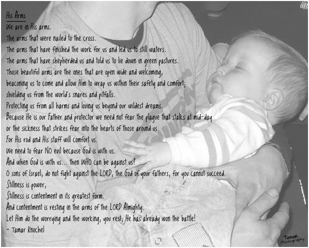 Do you have a spot where you routinely meet with God? A place that is set aside for that very special purpose? If not I suggest you find one, it’s amazing what a difference it can make! How just visiting that sacred spot can calm your soul, only if it’s for a brief moment. You can “still and quiet your soul; like a weaned child with its mother,” (Psalm 131:2) there. When a child is nursing its mother is its source of nourishment and therefore when it is in its mother’s arms it will fuss until it receives the milk it desires. However, a weaned child in its mother’s arms is a completely different story. Once weaned from its mother’s milk the child no longer seeks its mother’s arms for nourishment, but for company, for love, affection and comfort. So it also should be for us in our Father’s arms. We should be routinely (daily and weekly) seeking shelter from life’s storms under the wings of the Father who cares for us enough to engrave our names on His palms.