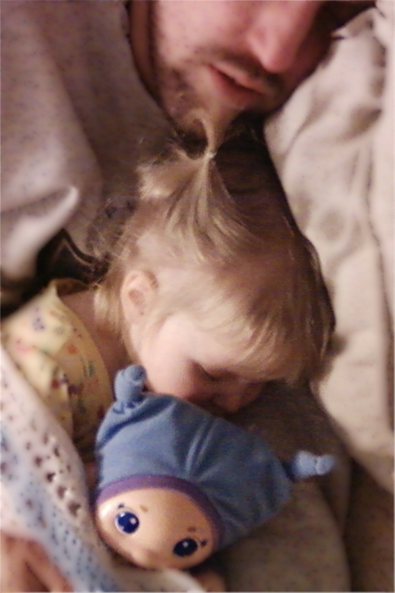 Around eleven Daddy came back into the living room. He gently touched my outside arm to wake me up and asked “Want me to take over?” His turn to help had finally arrived. He pulled back the blanket and gently lifted her from on top of me into his loving gentle arms. “She’s hot” he said, “I know” I answered. He situated himself in his recliner for the night as I headed off to our own luxuriously large bed all alone, well, with the cat.